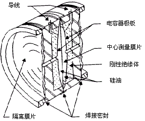 被測介質(zhì)的兩種壓力通入高、低兩壓力室,作用在δ元件(即敏感元件)的兩隔離膜片上,通過隔離膜片和δ元件內(nèi)的填充液傳送到預(yù)張緊的測量膜片兩側(cè)。測量膜片與兩側(cè)絕緣體上的電極各組成一個電容器,在無壓力通入或兩側(cè)壓力均等時測量膜片處于中間位置,兩側(cè)兩電容器的電容量相等。當(dāng)兩側(cè)壓力不一致時,致使測量膜片產(chǎn)生位移,其位移量和壓力差成正比,故兩側(cè)電容量就不等,通過檢測此電容極板上的差動電容,再由電子線路把差動電容轉(zhuǎn)換放大成4-20mADC的二線制電流信號。